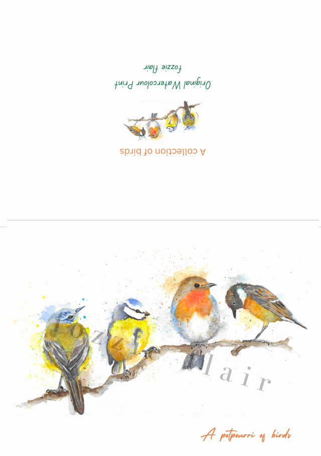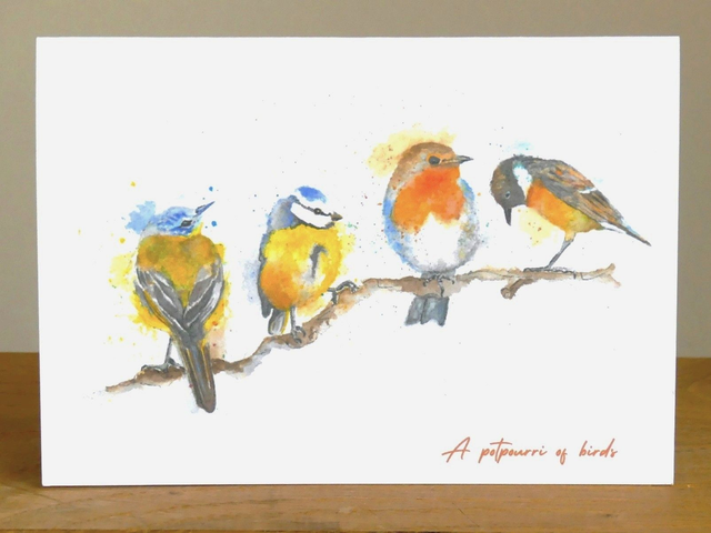 Print of an original watercolour painting, depicting a collection of British birds, printed on 250gsm matt ivory card. Blank inside.