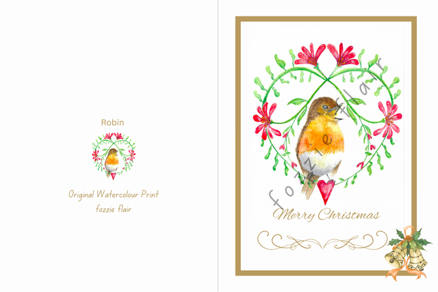 Print of an original watercolour painting, depicting a robin singing heartily within a heart-shaped garland, printed on 250gsm matt ivory card. Blank inside.
