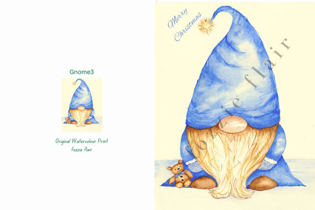 Print of an original watercolour painting, depicting a Christmas gnome in blue, one of a collection of 4 gnome cards, printed on 250gsm matt ivory card. Blank inside.