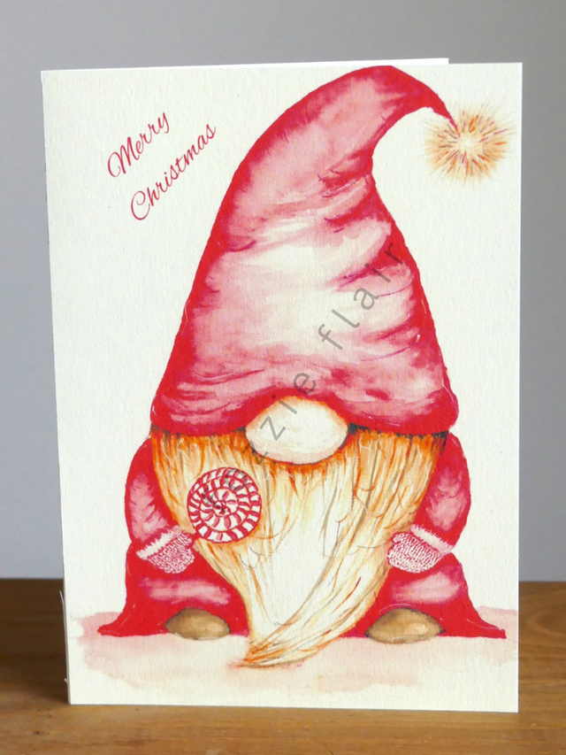 Print of an original watercolour painting, depicting a Christmas gnome in red, one of a collection of 4 gnome cards, printed on 250gsm matt ivory card. Blank inside.