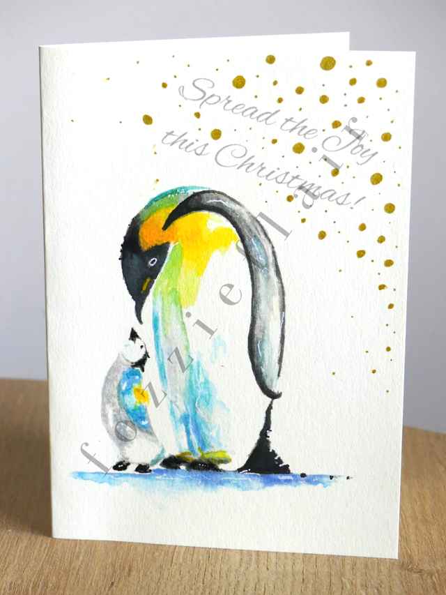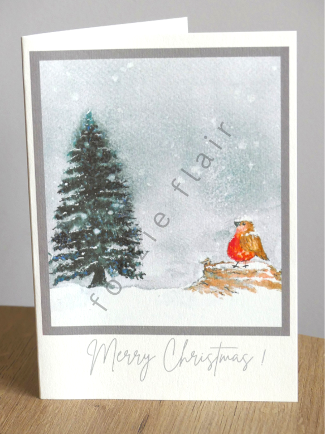 Prints of 5 original watercolour paintings of various individual cards also listed separately including various robins, a wren + penguins all printed on 250gsm matt ivory card. Blank inside.