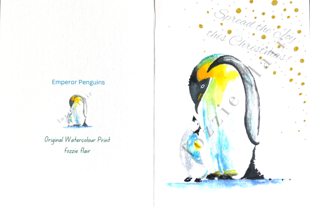 Print of an original watercolour painting, depicting 2 Emperor Penguins, parent + youngster in a loving pose. Each card may vary very slightly as each is embellished somewhat after printing. The image is printed on 250gsm matt ivory card. Blank inside.
