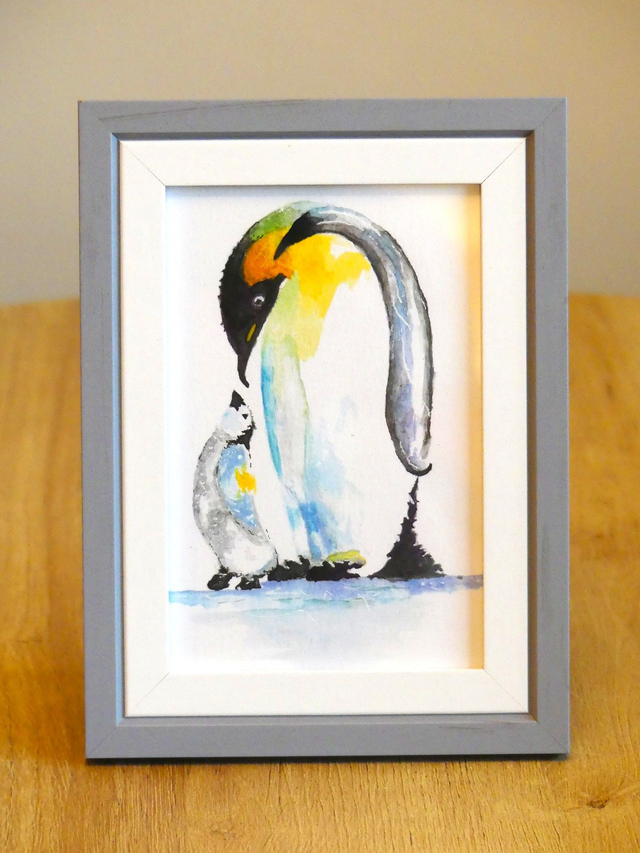 A print of my Original Watercolour painting of Emperor Penguins, printed onto 250 GSM watercolour paper and placed in a grey and white 7.5" x 6" frame with glass front. The frame can stand or be hung on the wall.