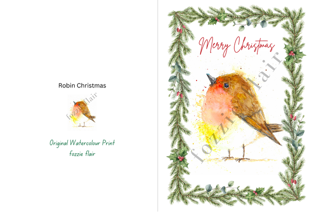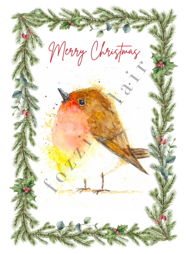 Print of an original watercolour painting, depicting a robin surrounded by a pine garland, printed on 250gsm matt ivory card. Blank inside.