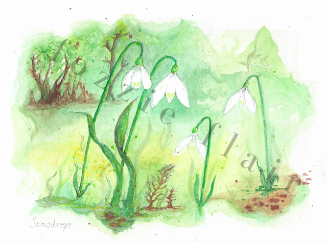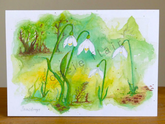 Print of an original watercolour painting, depicting snowdrops in a small glade, printed on 250gsm matt ivory card. Blank inside.